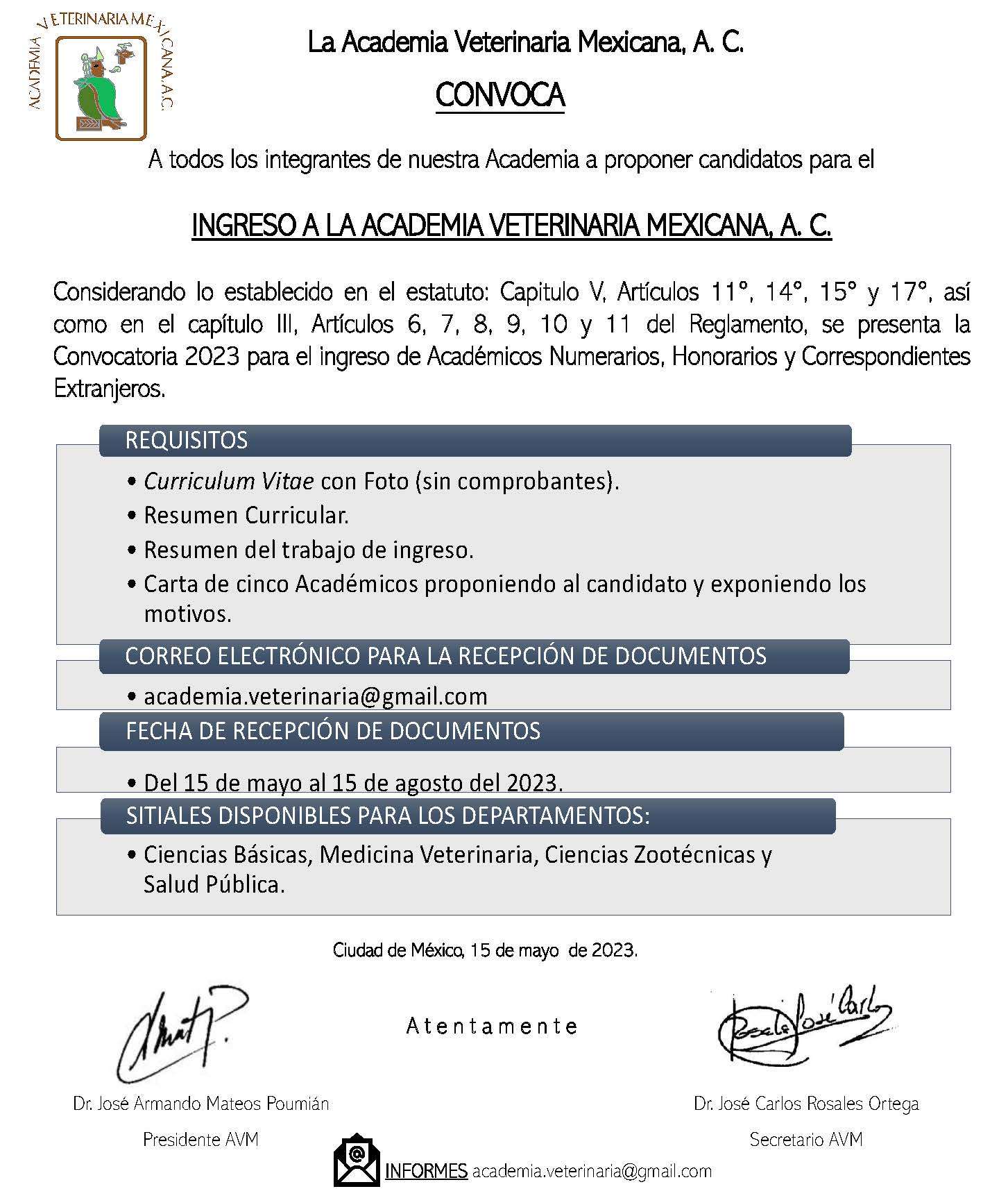 A todos los integrantes de nuestra Academia a proponer candidatos para el INGRESO A LA ACADEMIA VETERINARIA MEXICANA, A. C.