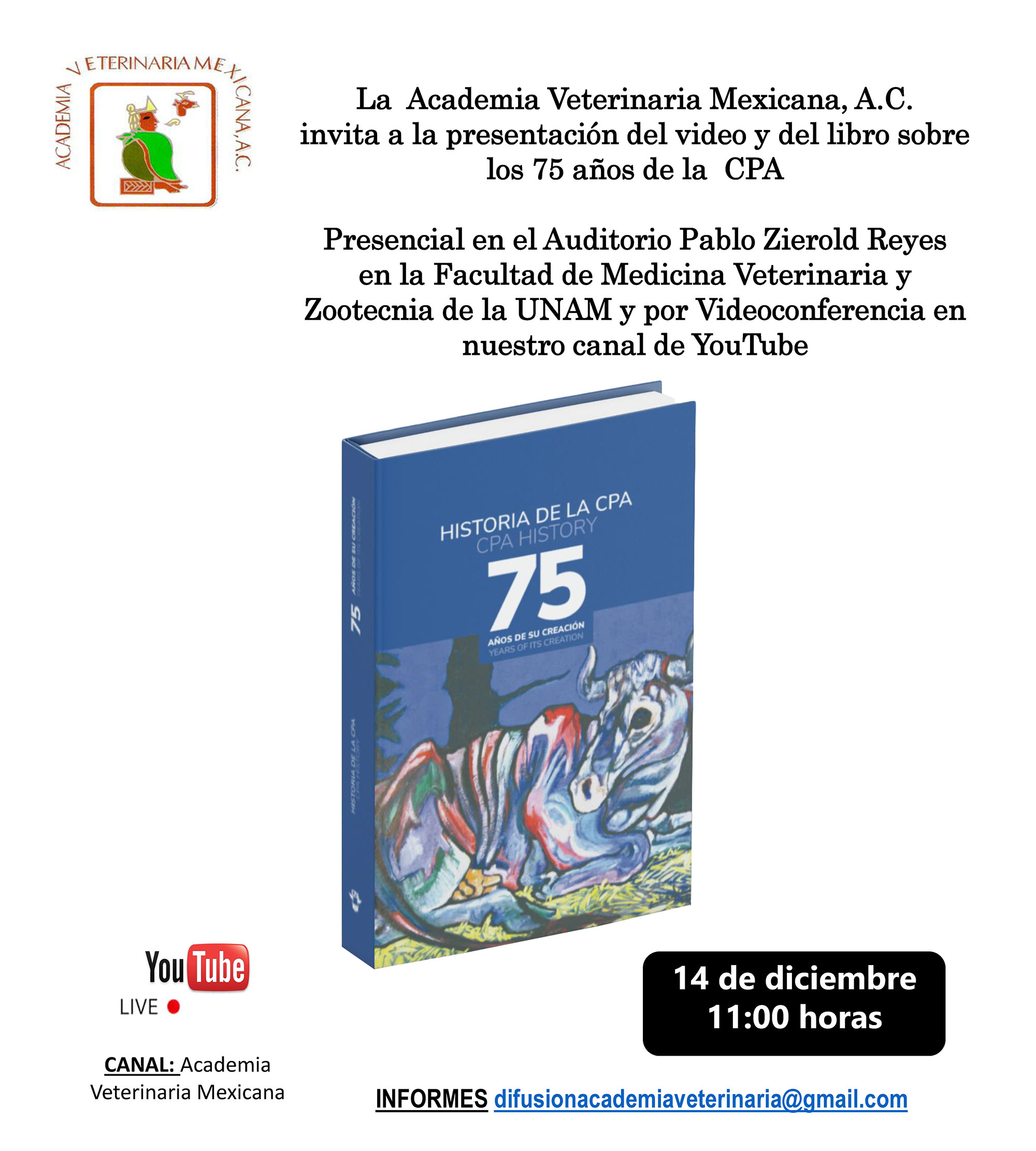 La sesión también podrá seguirse a través del Canal de Youtube de la Academia Veterinaria Mexicana: